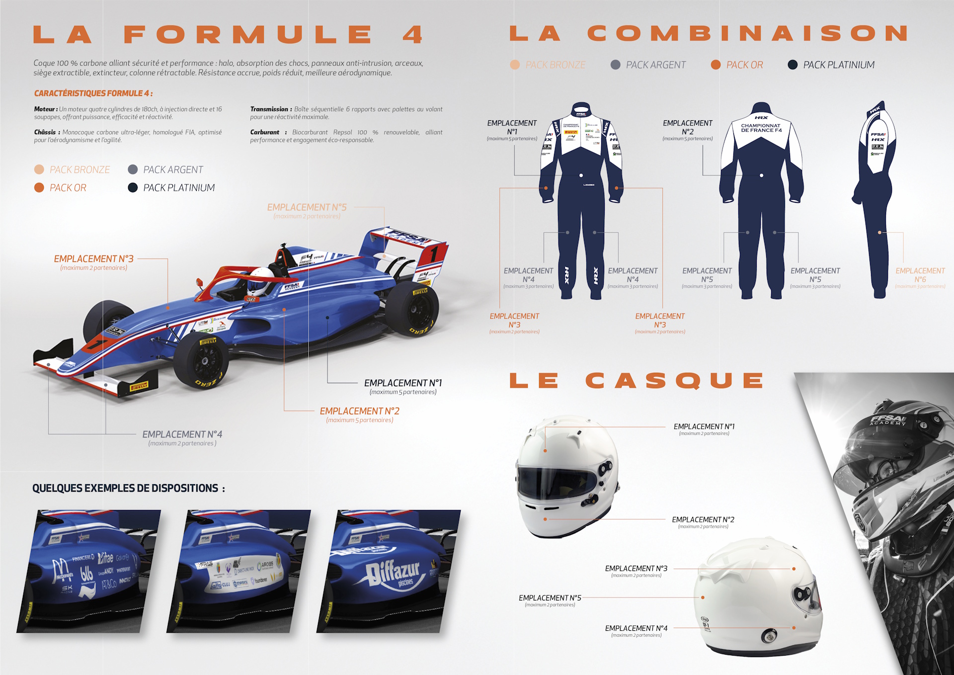 La voiture est le support de visibilité principal du projet. Présente sur toutes les courses du Championnat de France F4, elle assure une exposition forte sur les circuits, auprès du public, des équipes et des médias. Selon le niveau de partenariat, plusieurs emplacements permettent d’adapter la visibilité de votre marque, d’une présence associée à une position majeure au cœur de la voiture et de la performance.